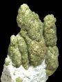 This lovely specimen of demantoid garnet comes from one of its most famous deposit. Its unusual shape is typical due to its "pillars" (some more than 6 cm tall!) made up of an aggregate of numerous well-shaped crystals which give the specimen its singular appearance. |