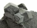 Afrosiderita y chamosita son los nombres, aún no reconocidos, con los que se conoce un mineral del grupo de la clorita. En este ejemplar y mediante un proceso llamado pseudomórfosis, cristales de granate almandino se transformaron en afrosiderita (chamo sita) conservando la forma de rombododecaedro característica de los granates. |
