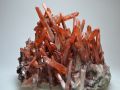 Algunos ejemplares de hematites con cuarzo procedentes de China presentan los cristales de cuarzo teñidos de rojo por la acción del hematites lo que los hace aún más espectaculares. Estos raros ejemplares se agotaron rápidamente. Este ejemplar lo incluímos en el cuarzo porque la presencia de hematites es insignificante. |