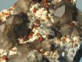 Cuando aparecieron en el mercado los primeros ejemplares de este yacimiento causaron verdadera sensación. Nunca se habían visto piezas tan bellas de espesartita en matriz. El yacimiento produce varios tipos de ejemplares, con frecuencia, de gran belleza. En el que mostramos aquí, los cristales de granate se hallan individualizados y dispersos sobre una matriz blanca de feldespato junto a cristales de cuarzo ahumado. Adquirido en Tucson en 2.004. |