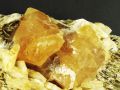 Conocida también como tungstita es una importante mena de wolframio (tungsteno). Este ejemplar muestra tres octaedros de scheelita sobre un lecho de moscovita y albita. Los ejemplares critalizados procedentes de China son, con toda seguridad, los más bellos del mundo. |